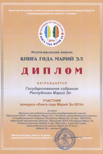 |  Издания Государственного Собрания Республики Марий Эл отмечены Дипломом участника VI Республиканского конкурса "Книга года Марий Эл – 2014". Подробности>>